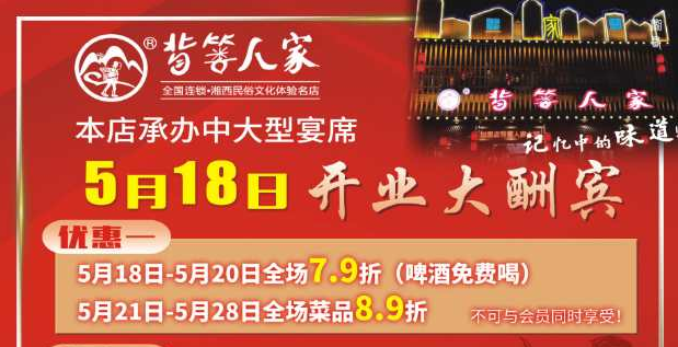 5月18日,經(jīng)過前期緊張的籌備、試營業(yè),背簍人家太湖店盛大開業(yè)啦!店內(nèi)可承辦中大型宴席,歡迎您的光臨,感受記憶中的味道!